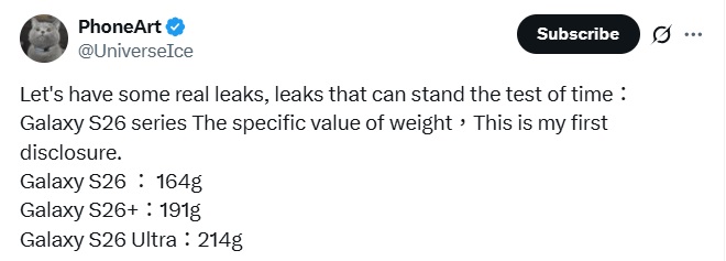 有趣的是,與 S26 與 S26+ 略增重量不同,Galaxy S26 Ultra 反而比 S25 Ultra 輕了 4g: