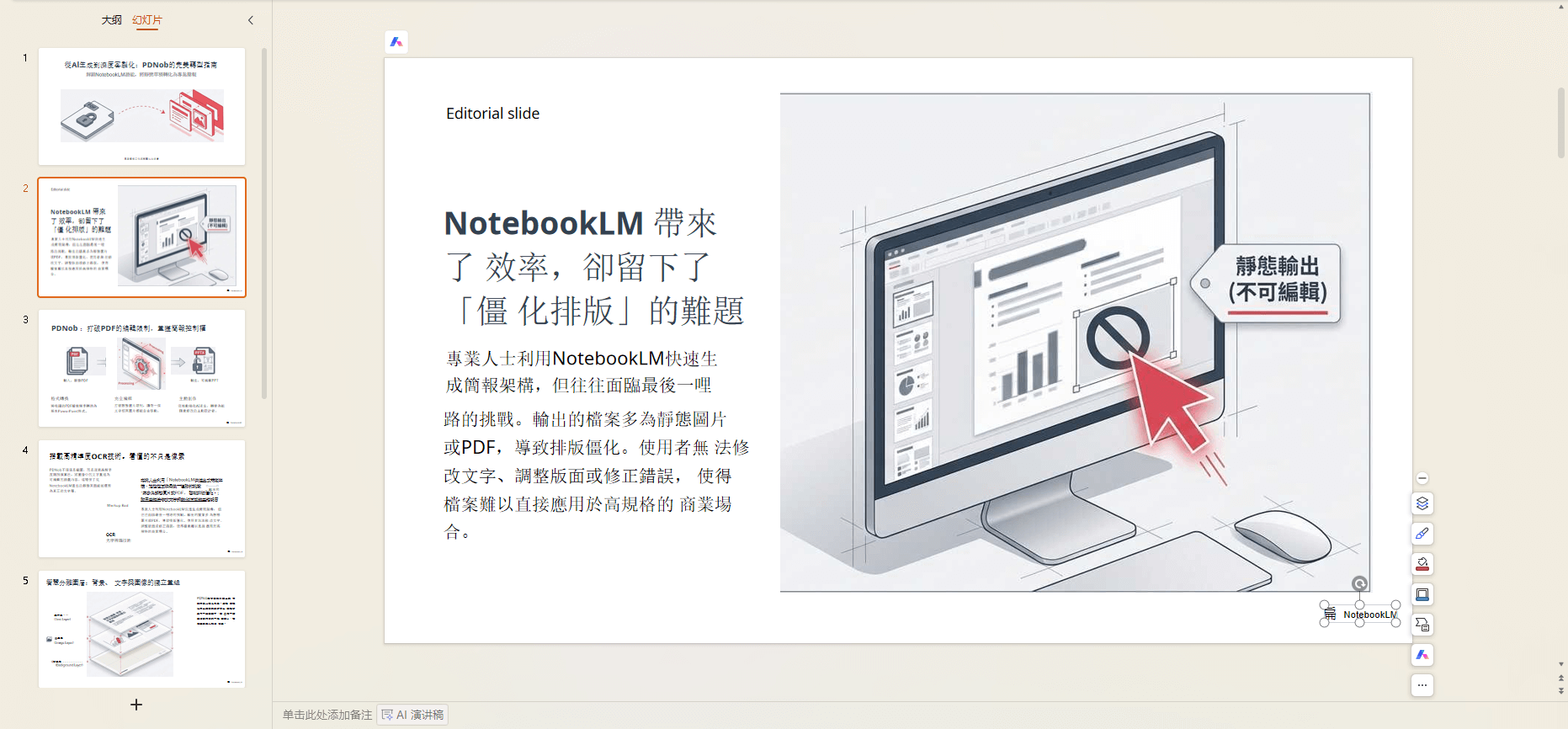 使用 PDNob,你可以把 NotebookLM 生成的 PDF 轉成完整可編輯 PPT,解決 NotebookLM 生成簡報無法修改的痛點,並清除浮水印與固定元素。